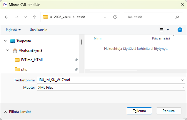 Homma alkaa rastimalla halutut sarjan kilpailun sarjojen joukosta normaalien tulosteiden teon tapaan. Ensimmäisen sarjan kohdalla ExTime kysyy kansiota, jonne sarjakohtaiset XML-tiedostot tehdään. Tiedoston oletusnimi alkaa aina vakiolla IBU. Sen perään tulee kisan kalenterinumero-kentässä oleva tieto. Esimerkissäni se on IM_SU eli Imatran Baltic cupin sunnuntain kisa. Tähän lisätään aina kulloisenkin sarjan tunnus, kuvassa siis W17-sarjan XML-tiedoston nimi. Kenttien välissä on aina ala-viiva (_). Jokaisesta sarjasta tarkistetaan, löytyykö urheilija IBU-kannasta, samalla urheilijalle haetaan siellä käytössä oleva nimi. Jos urheilijaa ei löydy, käytetään kisadatassa olevaa nimeä, josta poistetaan skandimerkit. Urheilijan tiedot kyllä menevät XML-tiedostoon, jossa niitä voidaan korjata tavallisella tekstieditorilla. Puutteista varoitetaan äänimerkillä ennen tiedostonimen valintaa. |