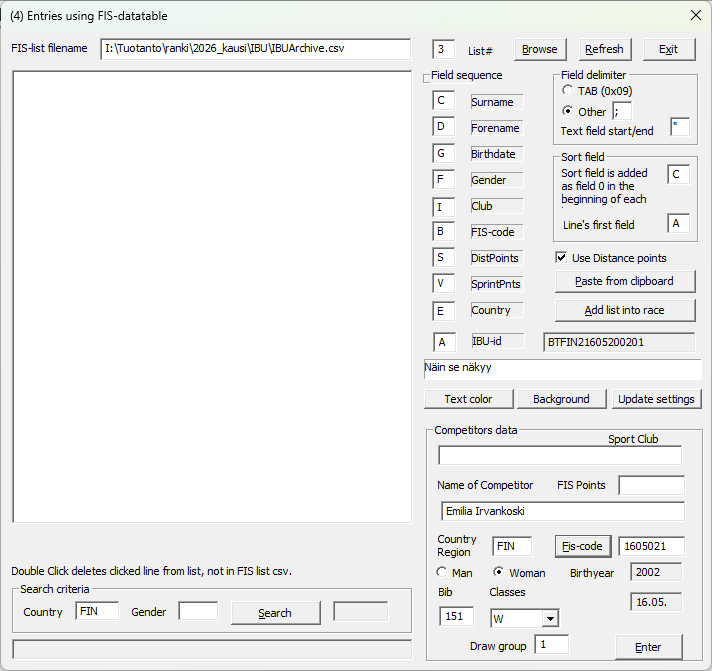 Aivan kuten maastohiihdossa voidaan käyttää FIS:n urheilijakannan tietoja ilmoittautumisessa hyväksi, sama voidaan nyt tehdä myös ampumahiihdossa. Tosin tätä tarvitaan lähinnä kansainvälisissä kilpailuissa, mutta saattaahan olla, että kotimaassakin tarvitaan tulevaisuudessa IBU-rankingin tietoja lähtöjärjestyksen teossa. Suositan IBU:lta saatavan csv-tiedoston sijaintipaikaksi ihan omaa /IBU-alikansiota ExTime-kansion alle. Kun kisan lajiksi on valittu , valinnan kautta avautuvaan näyttöön tulee IBU:n urheilijakanta normaalin FIS-kannan sijaan määrityksineen. Ensimmäisellä kerralla on syytä tarkistaa oikeat sarakkeet, korjata ne ja tallentaa -napilla. Valtaosa tiedoista on samaa kuin maastohiidossa, tietokenttien sarakkeissa on alimpana uutena IBU-id, joka on urheilijan yksilöivä koodi. Siinä on (valitettavasti) sotkettu useita tietoja (sukupuoli, maa, syntymäaika) keskenään ja saatu epäselvä, pitkä koodi. Urheiljat saadaan helpoimmin lisätyksi kisaan valitsemalla maa ja sukupuoli näyttöön samaan järjestykseen kuin he ovat ilmoittajan listalla ja valitsemalla siitä aina kisaan lisättävä urheilija ja painamalla ruudun nappia . Samalla kun lisäsin tämän uuden tiedon tähän näyttöön, lisäsin näytön asetusten tallettamiseen oman nappinsa (). IBU-id tallentuu urheilijan tietoihin, kenttään , kenttä näkyy urheilijan tiedoissa nimi-välilehdellä. Sitä tarvitaan, kun tuloksia siirretään IBUn tietokantaan. Siitä lisää myöhemmin. Näytön tarkempia ohjeita voi käydä katsomassa maastohiihdon puolelta (täältä). Uutta on myös tuon lista-ikkunan taustan () ja tekstivärien () säätömahdollisuus. Esimerkkikuvassa on korostettu Suvi Minkkisen tiedot, samalla näkyy hänen pistemääränsä IBUn järjestelmässä. IBU käyttää naisten koodina F-kirjainta, FIS:llä se taas on . Muista tämä kun näytön alaosassa valitset jonkin maan ja sukupuolen urheilijoita. |