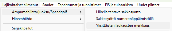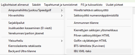 IBU ei vielä tue live-seurantaa FIS:n tapaan. Tulokset siirretään IBUn palvelimelle nettiliittymän kautta avaamalla kisan sivusto, valitsemalla sieltä sarja ja leikkaa/liimaa tekniikalla liittämään sarjan tulosikkunaan sarjan tulokset, joko XML- tai csv-tekstinä. En toista tässä IBUn ohjeita. FIS:in XML formaatti kelpasi melkein sellaisenaan IBUlle. Ainoat muutokset olivat <Penalties> ja <SkiTime> tagien lisäys. Toimintamuutos on se, että jokaisen sarjan tulokset pitää raportoida erikseen. Täydensin Ampumahiihdon lajikohtaista alimenua lisäämällä sinne alimmaksi toiminnon . |