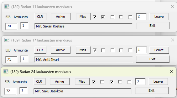 Esimerkkikuvassa olen valinnut itselleni merkattaviksi ratojen 11, 17 ja 24 laukauskohtaisten tilanteiden hoitamisen. Kuvasta näkyy, että radalle 11 on asettunut ampumaan yleisen sarjan Sakari Koskela ja hän on ampunut jo kaksi kertaa osuen kummallakin laukauksella. Sensijaan radan 24 kilpailija on ampunut jo kolme kertaa ja niistä yhden ohi. Merkkaus tehdään seuraavasti: