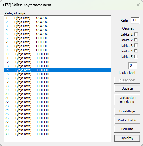 Näyttöön tulee ratojen tilanne-ikkuna, jossa näkyy ampumaratojen sen hetkinen tilanne. Tämä näyttö on tehty alunperin Kurvisen taulujen tilanteen seuraamista varten. Samalla näytöllä valitaan urheilijat/taulut myös stream-grafiikan kohteiksi. Ratavalinnassa näkyvät radat ja niillä parhaillaan ampumista suorittavat urheilijat ja ammunnan tulos. Näyttö ei päivity automaattisesti vaan sitä varten on -nappi. Radoista valitaan yksi tai useampia, jonka laukaukset halutaan merkata yksitellen. Valinta vahvistetaan napilla . Napin painnalluksen jälkeen itse valintaikkuna sulkeutuu ja halutut merkkausikkunat avautuvat alekkain ruudun oikealle reunalle. Koska merkkausikkunat sijoitetaan avattaessa aina alekkain, saattaa sinne alle jäädä jo aikaisemmin avattu merkkausikkuna piiloon. Ole tarkkana ja vedä päälläoleva ikkuna uuteen paikkaan. ExTime avaa merkkausikkunan jokaista valittua rataa varten. Saman radan valinta uudelleen sulkee merkkausikkunan. Merkkausikkunoita voidaan avata useita ja siirrellä niitä sopiviin kohtiin näyttöä. Ne pysyvät auki ja sallivat ExTimen muun käytön samanaikaisesti. Merkattavan radan numero on sidottu, se näkyy merkkausikkunan otsikossa eikä siis yhdellä merkkausikkunalla voi antaa laukauserittelyä kuin tältä nimenomaiselta radalta. |