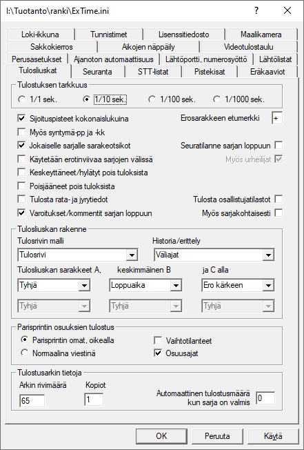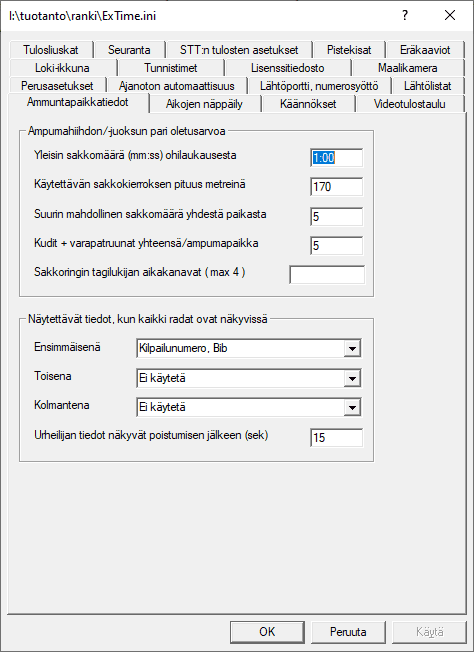 ExTimen yleisissä asetuksissa ( / , tai ratas-ikoni ja voidaan sarjakohtaisesti säätää, sensijaan yhdestä paikasta on koko kisaa koskevia tietoja. Ja tietysti, jos ohilaukauksesta tulee sakkokierros, aikasakon tulee olla nollaa. Sakkokierroksen pituudella ei ole merkitystä muualla kuin kierrettyjen sakkorinkien ylösmerkkauksessa. Syksystä 2025 lähtien sakot voidaan käsittää myös erilaiseksi virhetyypeiksi, jolloin sakkokappaleet ovatkin virhetyypin lukumäärät ja sakkomäärä on rangaistuksen arvo tästä virhetyypistä. Ampumapaikkojen määrä vertautuu silloin eri virhetyyppien määräksi. Sarjakohtaisissa tiedoissa säädetään tarkemmin, onko sarjan kaikissa sakkopaikoissa sama aikamäärä yhdestä kappaleesta (ohilaukaus/pudotus). Syöttövirheiden karsimiseksi annetaan paikkaa kohti. Ampumahiihdossa yleensä 5, mutta speedGolfissa/koskimelonnassa virheiden määrä reikää/virhelaatua kohti voi kasvaa suureksikin. Sakkoja hiirellä annettaessa näytössä on varattu määrän antamista varten 10 nappia (0-9), joista annettu määrä (5) on aktiivisena. on ampumahiihdossa yleensä 4, kaksi makuu- ja kaksi pystypaikkaa. Sarjaan ei voida perustaa tätä lukua enempää ampumapaikkoja. Teoreettinen maksimiarvo olisi 48, mutta neljä siis se yleisin käytetty. Eri sarjoissa ampumapaikkojen määrä ja etäisyys lähdöstä saa toki vaihdella vapaasti. Kun käytössä on erillinen sakkokierrosten tagilukija, sen tapahtumista saadaan erillinen lokitiedosto (sakko.log) kun kohta on rastittu. Kohdassa (oletuksena +) tulostuu sakkoerittelyssä ampumapaikkasakkojen väliin. IBU käyttää jossain kohtaa miinus(-)-merkkiä, siksi tämä kohta on lisätty. Näytettävät tiedot-alueen asetuksilla ohjataan/annetaan valotaululla näytettäviä tietoja. Alempana on lisää sarjakohtaisista tiedoista. |