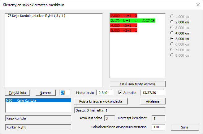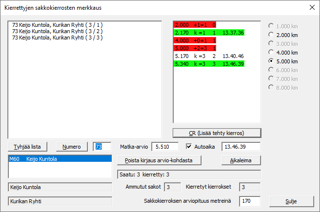 Ajanoton päänäytöllä suoritetut kierrokset näkyvät näin kun ensimmäinen ammuntapaikka oli 2 km kohdalla ja sakkokierroksen pituus 170 metriä: