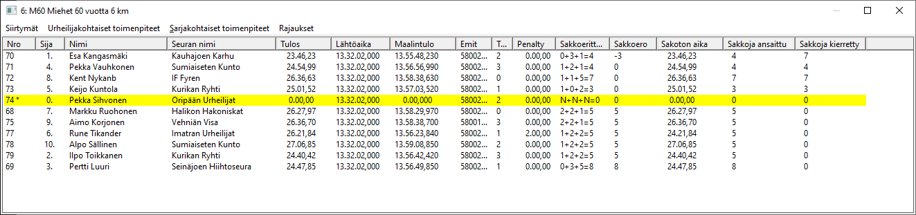 Kilpailijan tietojen korjauksen kautta voidaan myös muuttaa ammunnan tietoja. Ammuntatulokset omat samalla välilehdellä kuin Väliajat. Alaosan listasta valitaan ammuntapaikka, Sakot sekuntia/sakkokappale-ruutuun syötetään sakkomäärä ja päivitetään se paikalleen -napilla. Poistaminen tapahtuu joko -napilla tai antamalla Sakkomäärä-ruutuun pelkkä nolla. Kuvassa näkyy myös väliaikahistoria ja sakkojen vaikutus väliaikaan. Tässä esimerkissä yhdestä sakosta ei kerry lisäaikaa. Lähtöaika oli 10:58:01.190 ja 1.5 km ohitettiin ajassa 11:03.03 (5.01,9 oli kulunut aikaa). Sakkomäärät eivät vaikuttaneet väliaikaan, koska kierroksia kierrettiin. Kilpailijoiden tietoja päästään muuttamaan monesta eri kohtaa. Tässä tapauksessa helpoin tapa lienee yllä kuvatussa hiiren avulla tapahtuvassa sakkosyötössä tuplaklikata urheilijan riviä, sakkosyötöstä ei tarvitse välillä poiketa minnekään, vaan syöttö voi jatkua heti korjauksen jälkeen. Ampumahiihtokilpailuissa (kuten myös sileän hiihdossa) urheilijan saamat huomautukset ja rangaistukset on merkittävä niin, että ne näkyvät myös tulosluettelossa. |