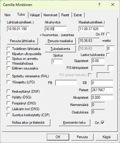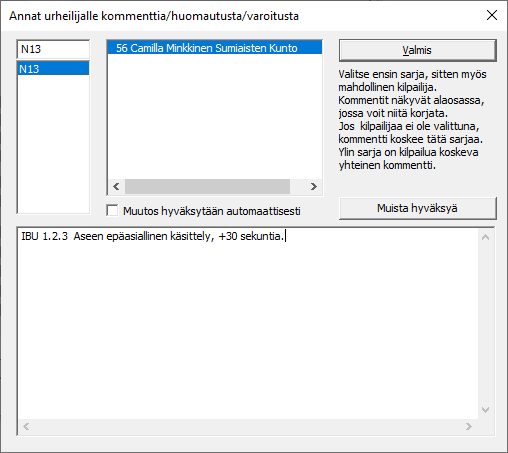 Rangaistuksen merkkauksessa on kaksi osaa, huomautustekstin antaminen ja mahdollisen aikarangaistuksen tuloksiin laskettavan määrän merkkaaminen. Molemmat annetaan urheilijan tietojen -välilehdellä. Äärimmäisenä oikealla on tilanne, jossa Camillalle ollaan antamassa huomautusta (keksitty tilanne ja sääntökohta). Kommentti-/ huomautusikkuna avautuu napista , ja napin jäljessä oleva väkänen kertoo, onko urheilijalla jo kommentti vai ei. Koska huomautukseen liittyy aikarangaistus, on se tämän määrä vielä erikseen kirjattava urheilijalle. Se merkitään -ruutuun (-välilehden yläosan keskellä). Aika merkitään sekunnin osien tarkkuudella, esimerkissä siis 30.00 on 30 sekuntia. Ja koska rangaistuksen on tarkoitus kasvattaa loppuaikaa, on luku siis + merkkinen. Vaikutusta voi testata -napilla. Jos urheilija saa taas esim. ikähyvityksiä tai hyvitystä odottelusta, se pienentää loppuaikaa ja on siis miinus (-) merkkinen. Ja jos urheilijalla on sekä rangaistuksia että hyvityksiä, niin siinä tarvitaan päässälaskua, vain yhteissummalle on tilaa, ei molemmille erikseen. Toki puhelinta voi käyttää laskukoneena, jos päässälaskutaito on ruostunut. |