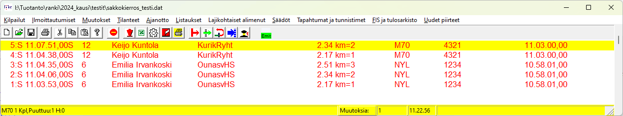 ExTime mahdollistaa sakkojen kirjauksen usealta eri työpisteeltä samaan aikaan ja jopa niin, että sakkojen syöttäjät näkevät toistensa syöttämät sakot. Tämä ennalta ehkäisee virheiden syntymistä ja vastaavasti tuo mahdolliset virheet nopeammin esiin. Jokainen sakkojen syöttäjä voi valita itselleen mukavimman tavan kirjata sakot, joko näppäimiä tai hiirtä käyttäen. Mikkelissä on toiminut erittäin hyvin työparina tapahtuva sakkokirjaus, toinen käsittelee penkalta saadut laput ja toinen käyttää ExTimeä. Samalla kaksi silmäparia tarkistaa mitä näytöllä näkyy. Tämän ohjeet alkuperäiset esimerkit olivat muuten vuonna 2016 Rovaniemen Toramossa pidetyistä ampumahiihdon SM-kisoista, sakkomäärät ovat kyllä ihan kuvitteelliset. Muut esimerkit ovat 11.-12.9.2021 rulla-ampumahiihdon SM-kisoista Hollolasta. Töissä olivat mm. Nikulat ja Pakkalan Erja. Ja uusimmat Oulun ampumajuoksun SM-kisoista syyskuulta 2024. Nikulat sielläkin. |