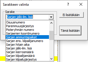 Ampumahiihdossa/juoksussa on hyvä valita sarjasta näytettävien tietojen sarakkeisiin ja . Esimerkissä näytän miten helposti ottaa silmään MYL-sarjan väärin merkitty sakkomäärä (60 sekuntia), kun se muissa sarjoissa oli 0, eli siis sakkokierros eikä aikasakko. Tuo allaoleva sarakkeen lisäys saadaan esiin hiiren oikealla napilla halutun sarakkeen kohdalla ja valitsemalla .