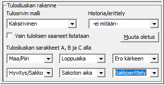 Paperitulosteita voidaan räätälöidä useallakin tapaa. Äärimmäisenä oikealla on malli kaksirivisestä tulostuksesta, jossa ylemmällä rivillä on sijoituksen, lähtönumeron ja nimen lisäksi mahdollisuus Piiri/alue-lyhenteeseen. Oikean reunan sarakkeilla on sitten loppuaika ja ero voittajaan. Jälkimmäisellä rivillä on seuran lisäksi puhdas hiihtoaika (juoksuaika) sekä sakko erittely. Tulostus on aseteltu menun valikoista kohdasta löytyvän näytön avulla. Sama säätömahdollisuus löytyy -ikkunan välilehdeltä .