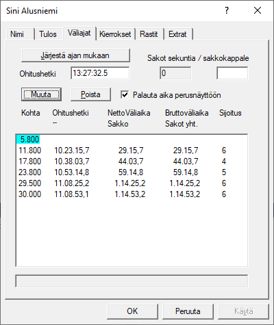 Jos nyt tuplaklikkaan Sini Alusnimen riviä ja valitsen urheilijan ominaisuus-näytöstä välilehden , näen (kuvassa oikealla), että Siniltä puuttuu väliaika kohdasta 5.8 km. Äskenhän sen juuri peruutin. Saman tuplaklikkauksen ja väliaikojen katselun voit siis tehdä aikakeruukoneen näytössäkin. Ohitushetki-ruutuun tulee ikkunan ensimmäisellä avauksella sen hetkinen kelloaika, eli tässä tapauksessa ohjeen kirjoitushetki, joten siitä ei kannata välittää. Urheilijan ruutu voidaan nyt sulkea. Nyt sitten suoritan kilpailijoiden numerojärjestyksen vaihtamisen oikeaksi (vain tässä esimerkissä, ei oikeassa elämässä). Vaihtohan tapahtuu ExTimessä näppärästi nuoli ylös ja alas-näppäimillä raahaamalla kilpailija oikean ajan luokse. Tai ottamalla hiirellä kilpailijasta kiinni ja vetämällä hänet oikean ajan luokse. |