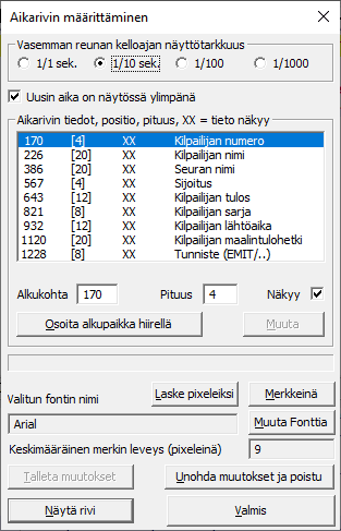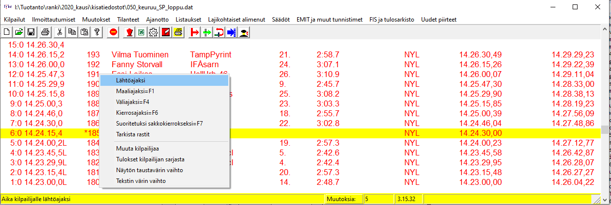 Nyt pääsen sitten kirjaamaan lähdöt oikein, eli numeron 180 oikea lähtöaika on 14.23.00,0, numeron 181 14.23.15,4 jne.