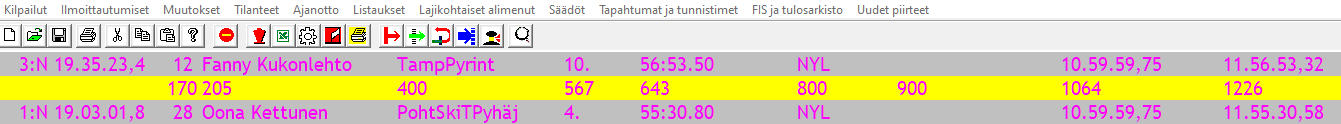 Kuvassa näkyvät käytettyjen sarakkeiden alkukohdat, 170 kilpailunumerolle, 205 nimelle, 400 seuralyhenteelle, jne. Muutetaan tilannetta vähän, siirretään sijoitus tuloksen jälkeen ja muita tietoja vähän vasemmalle ja katsotaan tilanne uudelleen: