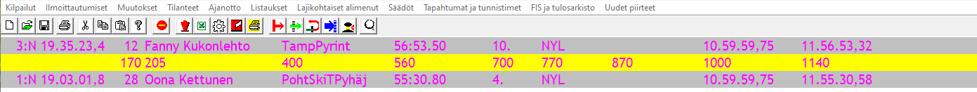 Näyttö kelpaa, asetukset talteen ja ajanottoon. Huomaa, että kilpailunumeron alkuun tulee tähti(*) merkki, jos kilpailija on poisjäänyt tai keskeyttänyt. Suhteellista fonttia käytettäessä säätö on hiukan hankalampaa, mutta lopputulos on sitten onnistuneempi.