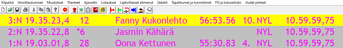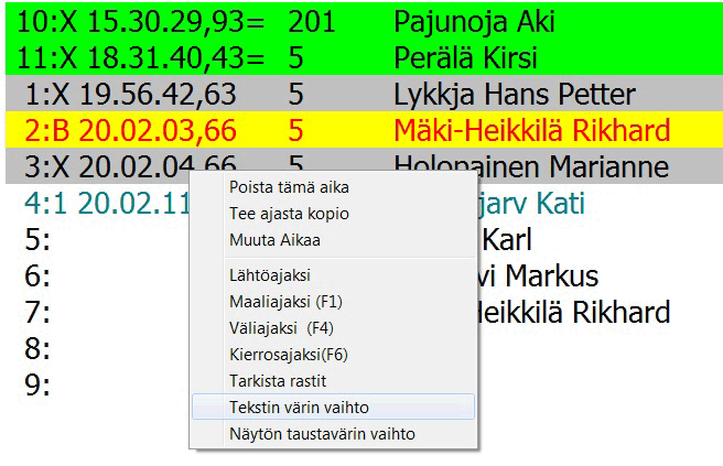 Pidä kuitenkin kohtuus värimaailmassa, tiukassa ajanottotilanteessa väreistä on apua, itse käytän lähtö- ja maaliajoille eri väriä, näin uskon vahinkojen määrä minimoituvan. Samoin kaikki hyväksytyt (=käsitellyt) ajat näytän vihreällä taustalla, ne siis OK.