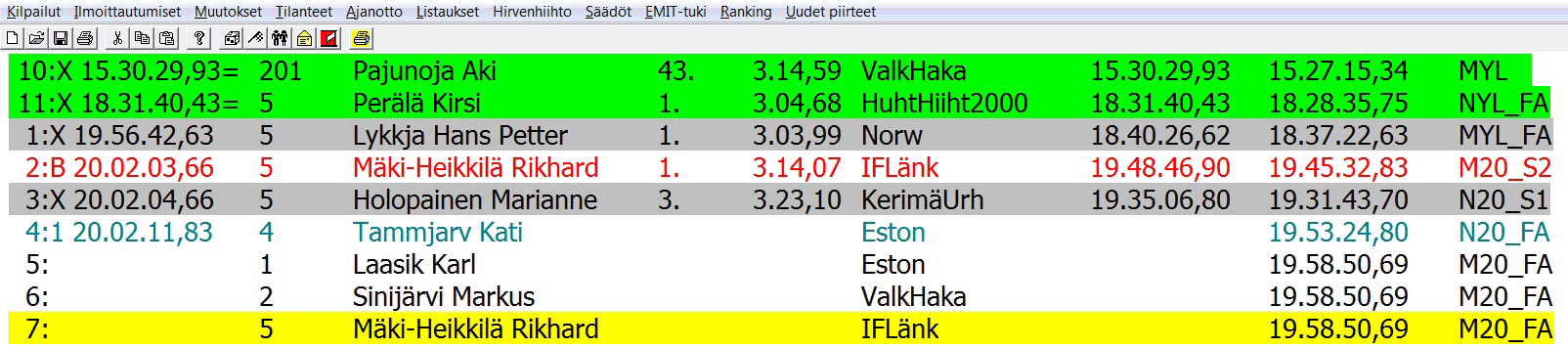 Allaolevassa esimerkissä on kaikki hyväksytyt loppuajat merkitty vihreällä taustalla, peruutetut (X, siis joltain peruutetut) harmaalla, väliaikaa esimerkissä esittävät (B) punaisella tekstillä ja varsinaiset valokennolta tulleet loppuajat (aikakanava on 1) sinisellä tekstillä.