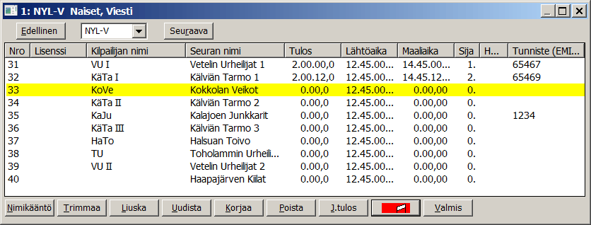 Suunnistuskilpailujen kaltaista rastipiteiden EMIT-määrittelyä ei tarvitse tehdä, leimojen tarkistusta ei tehdä, eikä tunnistimia tarvita kuin yksi joukkuetta kohti. ExTime siirtää EMIT-leimat automaattisesti viestijoukkueen jäsenille, kun se toteaa lukemansa tunnistimen kuuluvan joukkueelle. Tässä kuvassa näkyy Keski-Pohjanmaan maantieviestin naisten viestijoukkueet, jossa kolmella joukkueella on jo EMIT asetettuna. |