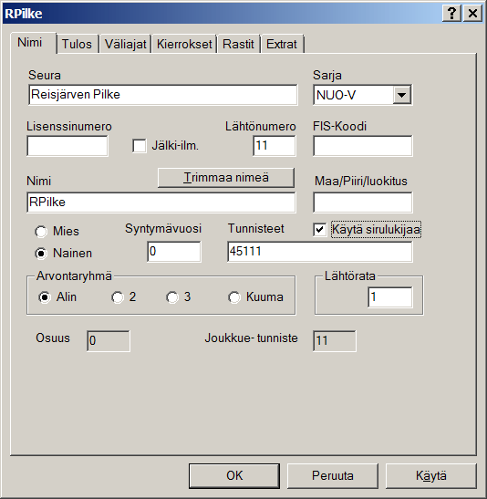 kilpailijalle. Vaihtoehdossa Käytä sirulukijaa on rasti (250-lukijan on siis jo oltava kytkettynä tietokoneeseen, katso alempaa) ja viestijoukkueen tietoikkuna on avattu. Nyt käytettäessä EMIT-kapulaa lukijassa, ExTime ottaa automaattisesti tunnistimen numeron tälle kilpailijalle. Mutta huomaa, ajat eivät tässä luvussa rekisteröidy, sitä varten on tietojen muutosikkuna suljettava ja luettava EMIT uudelleen. |
