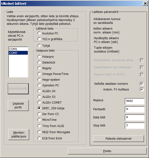 Valikon Ajanotto toiminnon Ulkoiset laitteet kautta otetaan sitten se EMITtejä lukeva lukija 250 käyttöön. Tässä olen varmuuden vuoksi vielä toistanut sen, että kellolta saadaan kilpailijan numero ja aika merkataan automaattisesti, omaa F1 näppäilyä ei tarvitse tehdä.Esimerkissä lukija on USB-sarja-adapterissa kiinni, siitä johtuu suuri sarjaportin numero (COM7). |