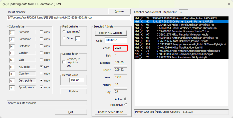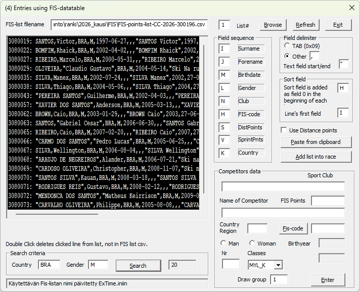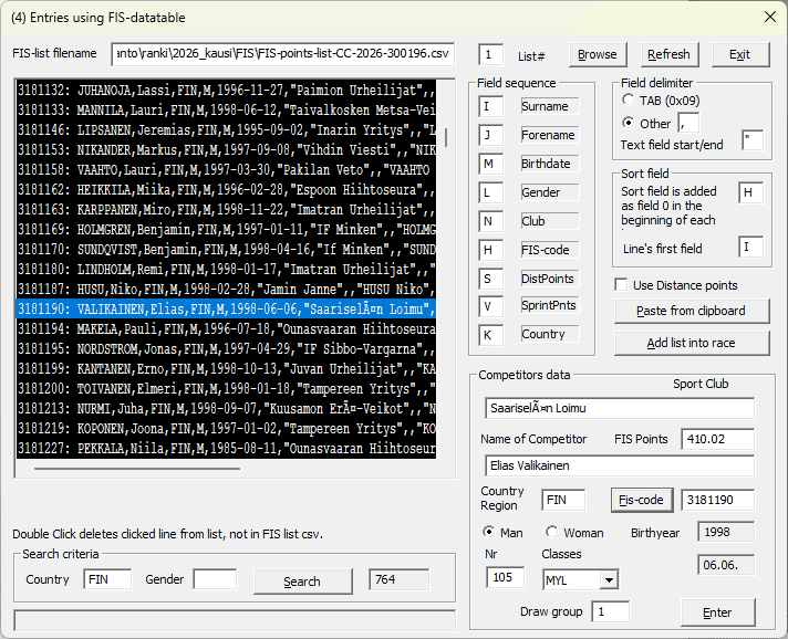 [FISLIST] Surname=I Forename=J Sex=L Birthdate=N Club=N Country=K FIScode=H FISPoints=S FISPointssprint=V filename=I:\Tuotanto\ranki\2026_kausi\FIS\FIS-points-list-CC-2026-300196.csv delimiter=, text_start=" Sort=D First=G Fislist=1 missingpoints=999.00 FIS-entries window contains a special part Field sequence, where the data field sequences and delimited character are defined. The definitons are automatically saved in the file extime.ini into section labelled [FISLIST]. |