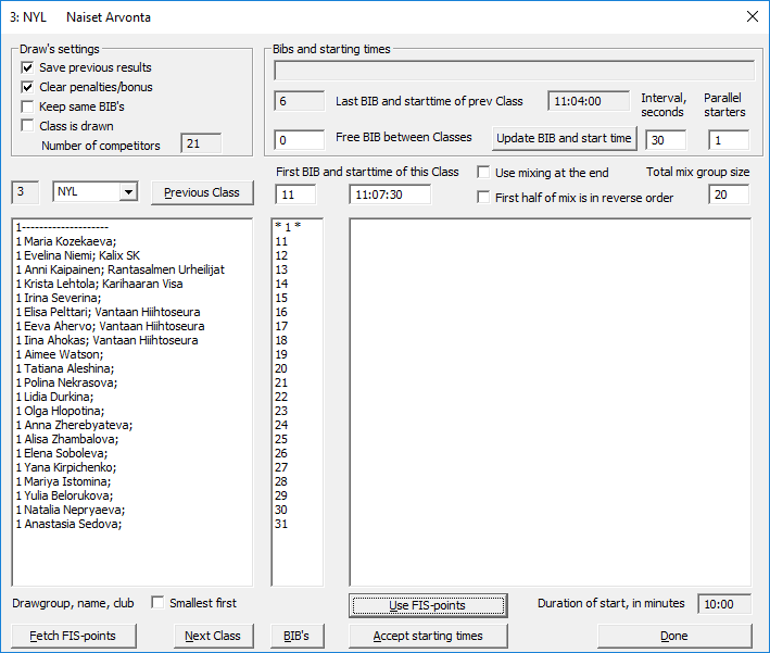 To make starting order is very easy procedure. Before drawing you should set the classess same order in race file as they will start. Of course you must have current starting times and numbers (BIBs) to be used. The drawing procedure can be found in menu , , . |