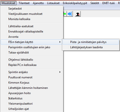 The file is normally comma delimited file (like csv-files exported from Excel) and the field delimited can be TAB-character or any other visible character, normally semicolon (;). You can load your own copy from FIS-web-site (https://www.fis-ski.com/DB/cross-country/fis-points-lists.html). Just select correct list (normally 8 lists / season) and select the csv format (full list in CSV when cursor is over text csv). After loading the csv-file (make folder FIS under c:\ExTime), you must tell ExTime the name and folder of newest file and which is the sequence of the columns in file. Sometimes FIS makes changes the columns, that's why you must define the column order fo ExTime. To start making entries define first the classes to be used in the race or open the existing race file. Starting ExTime version 8.4.8 it is also possible to use clipboard to move the FIS-codes from different Excel-sheets directly to ExTime. I made it to help my own work, when I made the startlist for Scandinavia Cup 6.-8.1.2017 in Lahti. Menu contains new task, . |