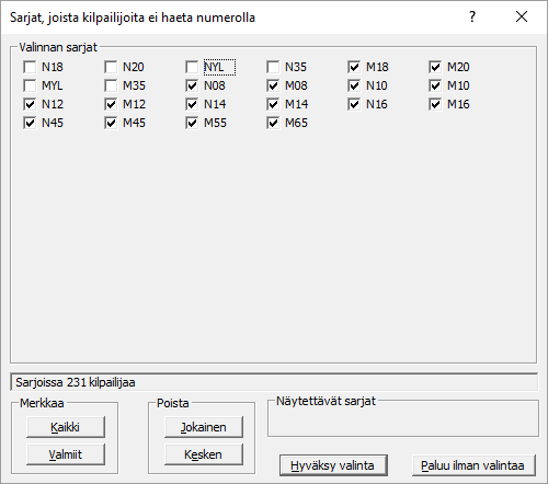 Sometimes (quite often) there is need to update FIS-points information before drawing. Some entries are made by hand, some by loading data from KILMO, but every competitor must have an active FIS-code to have FIS-points. The updating procedure can be found in menu , , . If the race contains also classes outside FIS-classes, it would be convient to eliminate those classes from updating procedure. This can be done using menu , . Check the classes you will eliminate from update and accept you choose by clicking . |