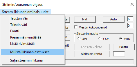 Valitsemalla striimin/seurannan ohjausikkunan menusta saa esiin valikon, jonka avulla pääsee valitsemaan teksti-ikkunalle sopivan taustavärin, selkeästi erottuvan tekstien värien ja kirjainten fontin ja koon. pudottaa näyttöön tehtävien rivien määrää yhdellä (oletus on 3) ja taas kasvattaa sitä yhdellä. Alarajana on tietysti yksi ja ylärajaksi koodasin 20 tekstiriviä. -valinta siirtää valinnat talteen INI-tiedostoon, josta ne sitten seuraavalla ExTimen käyttökerralla tulevat automaattisesti käyttöön. |