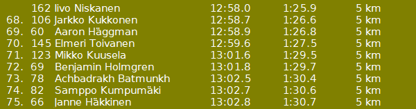 Tässä kuvassa on otettu Iivo seurantaan hänen lähestyessään 5 km kohtaa Pyhäjärven SM-kisoissa 2021. Näyttö uudistuu puolen sekunnin välein, ja seurattavan urheilijan alapuolella näkyvät ne, jotka Iivolla on vielä mahdollisuus ohittaa. Joni Mäen kärkiaikaan 11.32.1 on enää 9.0 sekuntia aikaa. Tiedot vasemmalta oikealle ovat Sija, Numero, Nimi, Väliaika, Ero kärkeen ja Väliaikakohta. |