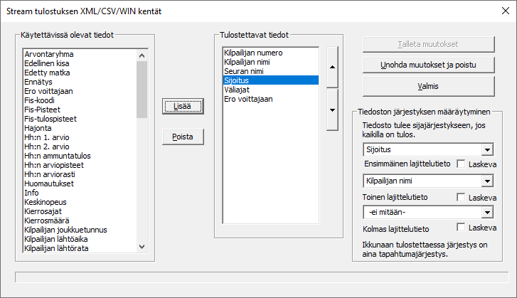 Kaikissa tapauksissa urheilijasta näytettävät/tulostettavat tiedot valitaan samalla, napista aukevassa ikkunassa. Kun tulostusvaihtoehtona on tiedosto (XML/CSV) myös tiedoston järjestys voidaan valita. Ikkunaa (WIN) käytettäessä järjestys on aina tapahtumajärjestys, uusin ylimpänä. Toinen ero on väliaikojen/kierrosaikojen tulostuksessa. Tiedostoon (XML/CSV) menee aina kaikki väliaikapisteiden/kierrosten ajat, kun taas ikkunaan (WIN) menee vain valitun paikan aika. Tulostettavat sarjat valitaan tuttuun tapaan rastimalla halutut sarjat. Rastimis-ikkuna avautuu napista . Ikkunaa käytettäessä () ei valitulla sarjalla ole merkitystä. Sensijaan väliaikapisteen valinnalla on, vain valitun pisteen tapahtumat näytetään. Jos pistettä ei ole valittuna, näytetään ensimmäisen pisteen tapahtumat. Ja kyllähän se sarja sikäli vaikuttaa, että vain valitun sarjan väliaikapisteet ovat valittavissa. Jos sarjaa ei ole valittu, käytetään taas ensimmäistä sarjaa. |