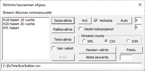 Tiedoston nimi näkyy alimmassa kentässä ja sitä päästään vaihtamaan napilla , kun tiedosto, joko tai , on valittuna. Jos vaihtoehto on valittu, niin stream-ikkuna avautuu napilla . Ikkunaa voidaan siirtää haluttuun paikkaan viemällä hiiren kursori ikkunan päälle, pitämällä hiiren vasenta nappia alhaalla ja vetämällä sitten ikkuna haluttuun paikkaan. Tietty urheilija voidaan ottaa myös seurantaan. Urheilija, jonka numero on annettu napin oikealla olevassa ruudussa, haetaan ja näytetään, jos hän on mukana kisassa (ei DNS/DNF) eikä hänellä vielä ole loppuaikaa. Nappia on toki painettava. Jos urheilija ei ole vielä lähtenyt, näytetään lähtölistaa, muuten ensimmäistä sellaista paikkaa, josta urheilijalta vielä puuttuu aika. Siis joko seuraavaa väliaikakohtaa tai maalia, jos väliaikoja ei oteta. Pikareitti seurantaan on ajanottonäytössä annettava kilpailijan numero ja S-kirjain, aivan kuin numero + K urheilija ilmoitetaan keskeyttäneeksi. |