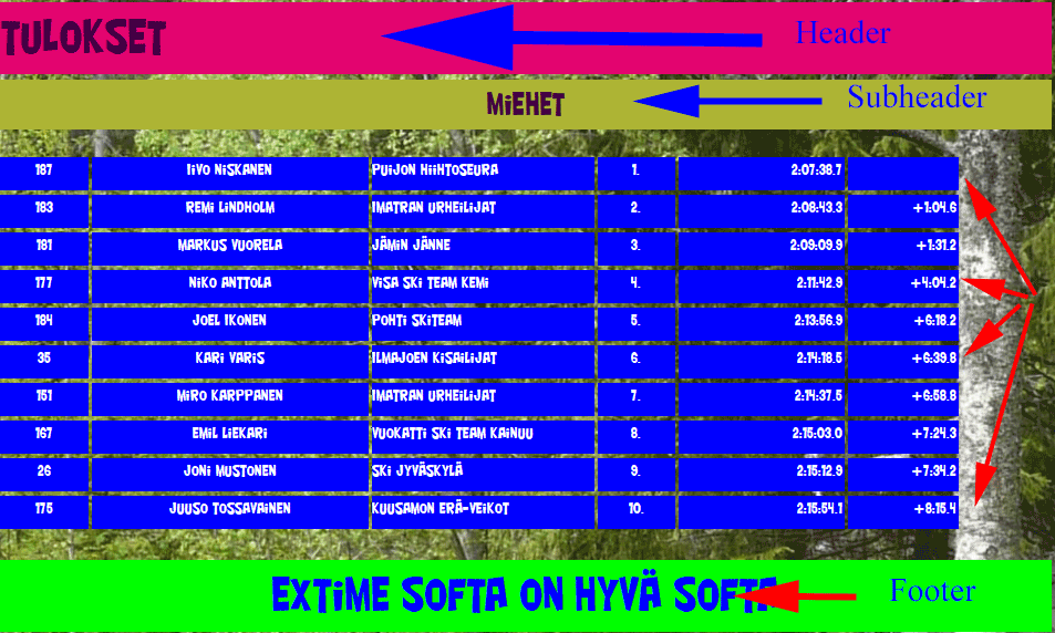 Kuvassa (videoseinä kaksi, wall_2) on neljä kehystä, joissa vain kolmannessa on useampi kuin yksi grafiikkalaatikko. Kolmatta kehystä toistetaan 10 kertaa. Ini-tiedostossa seinän kuvaus näyttää tältä: [wall_2] Nimi=Tulokset Algoritmi=4 Parametri=0 Paikka=9999 Timer=30 Left=2498 Top=139 Width=1060 Height=569 frame_1=Header frame_2=Subheader frame_3=Urheilijat frame_4=Footer Kehys 3 on tuo toistettava kehys, ja siinä on kuusi laatikkoa, joita siis toistetaan alekkain 10 kertaa tai niin monta kertaa, kuin urheilijoita riittää. Algoritmi=4 viittaa tuohon yllä esitettyyn videoseinän näyttämisen käsittelysääntöön. Paikka=9999 tarkoittaa maalin kohtaa, 0 olisi lähtö ja 1 .. n on väliaikapisteen järjestys tai kierrosnumero. Left, Top, Width ja Height ovat videoseinän paikka ja koko näytönohjaimen pixel-avaruudessa ja Timer=30 on alussa haluttu näytön päivitystahti sekunneissa. Valitettavasti määrittelyissä on sekakieltä, mutta siihen on syynä. Palaan noihin määrittelyihinkin tarkemmin alempana. |