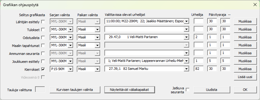 Kun -ruutu on rastittuna, päivityslaskuri toimii sekunnin välein ja pienentää jatkuvan seurannan laskureita. Jos rasti puuttuu, ei automaattipäivitys ole toiminnassa. Nappi avaa valintaikkunan, jossa näkyvät sillä hetkellä ampumapaikalla olevat urheilijat. Näistä valitaan ne, joiden ammuntaa seurantaa halutaan seurata. Nappi avaa suodatinikkunan, jossa voidaan valita matkan mukaan, mitä väliaikapaikat tai kierrokset näytetään väliaikojen tai kierrosaikojen laatikossa. Sen esimerkki löytyy alimmaisimpana. Painamalla -nappia tapahtuu videoseinän päivitys heti. Jos useampi seinä on yhtä aikaa näytettävissä (käytännössä kai aika harvoin tarvetta), kaikki seinät päivittyvät samalla kertaa. -nappi sulkee ohjauspöydän ja kaikki auki olevat videoseinät. |