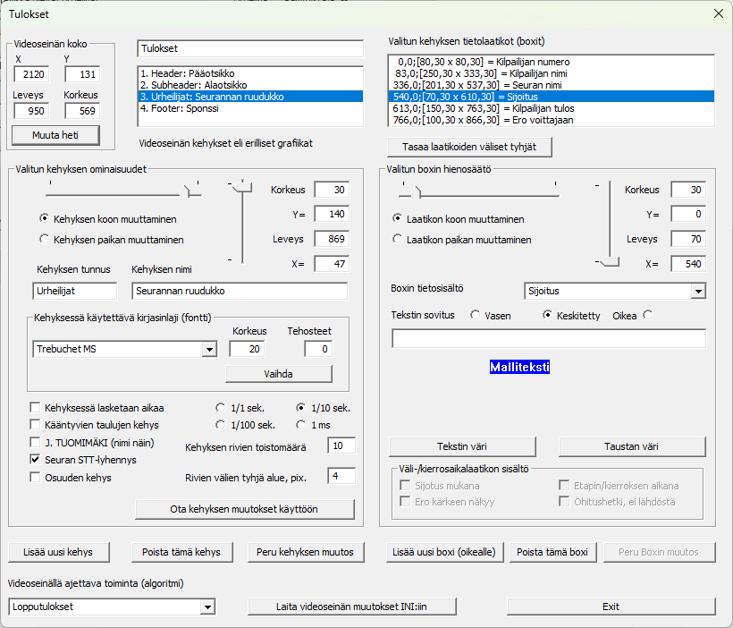 Työkalun vasemmassa reunassa ovat kehyksen tiedot muokattavina. Kehyksen paikkaa ja kokoa voidaan säätää liukukytkimillä, ensin valitaan tietysti, kumpaa muutetaan, paikkaa vai kokoa. Säätimien asteikko on prosentteja (%) koko videoseinän alueesta. X on vasemman reunan koordinaatti pixeleinä ja Y ylärivin koordinaatti, samoin pixeleinä ja ne lasketaan videoseinän vasemmasta yläkulmasta. Jos videoseinän paikkaa ja kokoa muutetaan (vasen yläkulma), kannattaa napin napsauksella laskea liukukytkimille uudet arvot. Sama pätee kehyksen sisällä olevien boxien liukukytkimiä, se tapahtuu napin kautta. Yhden kehyksen kaikissa laatikoissa käytetään samaa kirjasinlajia ja kokoa sekä ajan tarkkuutta. Kehyskohtaisesti ilmoitetaan myös muita säädettäviä tietoja, kuten nimen esitysasua, seuran nimen lyhentämistä, jne. Näistä lisää alempana. Työkalun oikeassa reunassa ovat sitten kehyksen laatikoiden tiedot valittavina ja muokattavina. Samoin kuin kehyksen paikkaa ja kokoa myös laatikkoa voidaan säätää liukukytkimillä. Säätimien asteikko on prosentteja (%) kehyksen alueesta. X ja Y lasketaan kehyksen vasemmasta yläkulmasta. Kehyksen korkeus tarkoittaa yhden tietorivin korkeutta. Jos tietoriviä toistetaan (esim. 10 urheilijaa näytössä), niin kehyksen kokonaan viemä tila näkyy -kentässä, esimerkissä siis 336 pixeliä. Se saadaan laskemalla kehyksen korkeus (30) kerrottuna toistoilla (10) lisättynä välien määrä (9) kertaa rivien välinen tyhjä alue (4) eli 10*30 + 9*4=336. -nappi asettaa kehyksen laatikoille vaakasuunnassa yhtä suuret välit. Jos laatikkojen yhteenlaskettu leveys on suurempi kuin kehyksen kokonaisleveys, väliksi asetetaan kehyksen rivien välinen etäisyys ja silloin on myös kehyksen kokonaisleveyttä kasvatettava (käsin), muuten oikea reuna kehyksestä ei näy oikein. -valintalistasta valitaan videoseinän toiminnan ohjelma. Nyt on valmiina seuraavat, alussa on algoritmin numero: