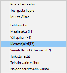 Aika kiinnitetään kierrosajaksi F6-näppäimelläKilpailija, jolta löytyy kierroshistoriaa, näkyy hiukan eri tavalla perusnäytössä. Loppuajan kohdalla ovat kierrosmäärä, jonka perässä on kaksoispiste, sitten on viimeiseen kierrokseen käytetty aika ja suluissa sijoitus tällä kierroksella. Ajanoton perusnäytön toiminnassa vaihtuu ainoastaan kiinnitysnäppäin. Normaalisti loppuaika sidotaan kilpailijaan F1-näppäimellä ja väliaika F4-näppäimellä. Kierros merkataan kierretyksi F6-näppäimellä, kuten aikasarakkeella tapahtuva hiiren oikean näppäimen painalluskin näyttää (oikealla). F6-näppäyksen jälkeen tiedot vaihtuvat tätä uutta kierrosta vastaaviksi tai jos kyseessä oli viimeinen kierros, kilpailijalle tulee myös loppuaika tämän viimeisen kierroksen loppuhetkestä. |