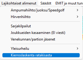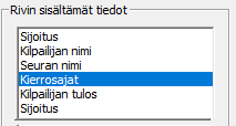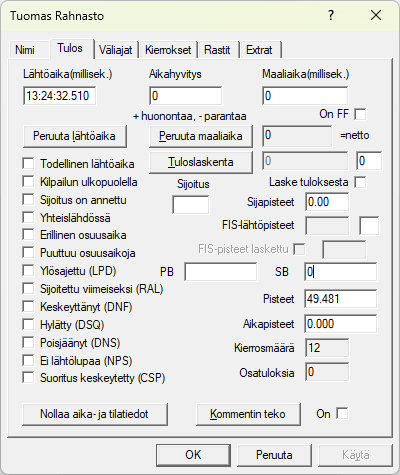 Kilpailijoiden tietoihin ei etukäteen tarvitse tehdä minkäänlaisia täydennyksiä kierrosaikojen ottamista/laskemista varten. -välilehden oikeassa alakulmassa näkyy kertyneiden kierrosten määrä ja -välilehdellä on koko historia nähtävissä ja korjailtavissa. Urheilijan -kenttää ei pääse muuttamaan kuin epäsuorasti, joko lisäämällä tai poistamalla kierroksia. Siitä alempana lisää. |
