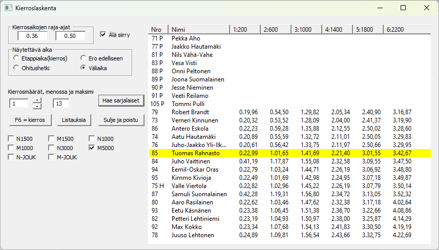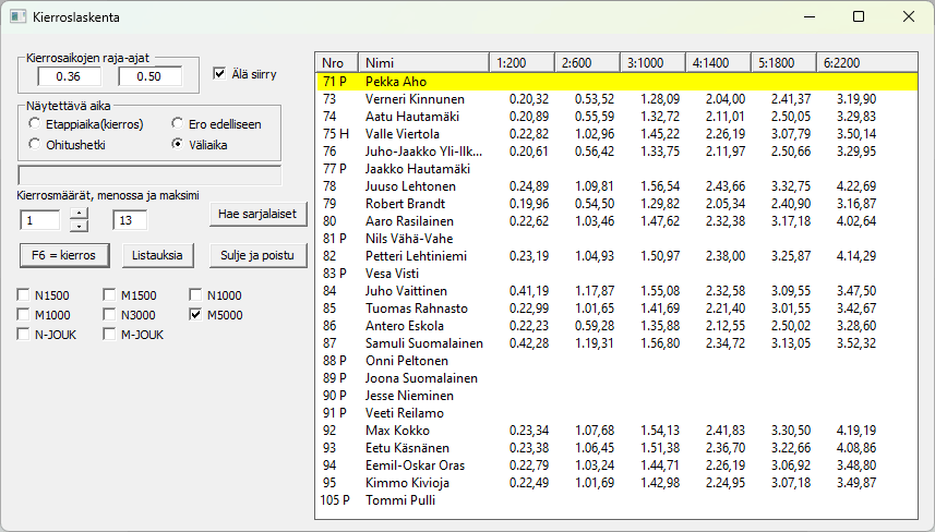 Rasti sarjat ja HaeEsimerkissä on valittu sarja M5000 ja sarjassa on jo kaikki kierrokset saatu kaikilta, paitsi poisjääneiltä. Sarakeotsikkoon tulee ensimmäisen urheilijan sarjan kierrospituudet. Tämä perustuu oletukseen, että kerralla otetaan vain yhden sarjan urheilijoille kierrosajat tai että matka ja kierrospituudet ovat kaikissa sarjoissa keskenään samat. Listan yläosan sarakeotsikkoja klikkaamalla ExTime lajittelee listan klikatun sarakkeen mukaan joko nousevaan tai laskevaan järjestykseen. Keltaisella merkityn aktiivisen kilpailijan ohittaessa tarkkailupisteen hänelle otetaan aika painamalla -näppäintä tai klikkaamalla näytön painiketta . Aputietona näkyy kierrokselle mahdollisesti annetut raja-ajat ja sarjassa kilpailtavien kierrosten määrä. Menossa olevaa kierrosmäärää voidaan muuttaa laatikon vieressä olevilla ylös/alas-napeilla, samalla ko. kierrokset rullaantuvat näyttöön. Kierrosmäärä on vasemman puoleisimman näkyvän kierroksen numero, eikä näyttöön saada enempää kierroksia kuin mitä on valitun kilpailijan sarjaan ilmoitettu. Vaihtoehtorasti ruudussa pitää saman urheilijan valittuna. Mikäli rastia ei ole, ExTime siirtää valinnan kierrosajan klikkauksen jälkeen automaattisesti alapuolella olevan kilpailijan riville. |