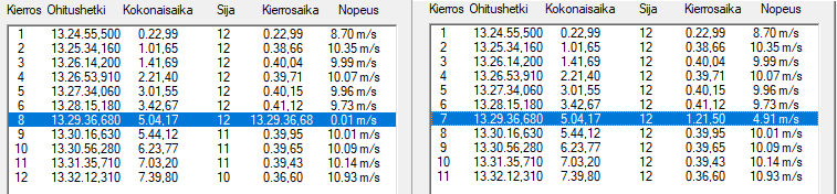 Aina poistettaessa kierros sen kelloaika ilmestyy -ruutuun. Siitä se voidaan leikkaa/liimata/korjata oikeaan paikkaan/kilpailijalle. Jos lisäksi -ruutu on rastittuna, aika tulee ajanoton perusnäyttöön aikakanavan X aikana. Siitä se voidaan näpäyksellä lisätä jollekin muulle kierrosajaksi, jahka tietysti ensin samalle riville on annettu kilpailijan numero. Valitettavasti kierroslaskentanäytössä tehtyjä korjailuja ei voi peruuttaa, en ole vielä tehnyt riittävän suurta oho-näppäilyjen säilytyspaikkaa. |