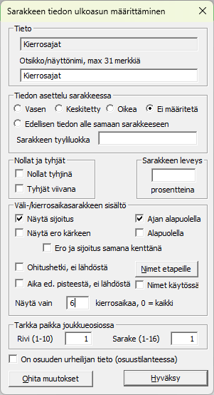 Reisjärven 24 tunnin kilpailua tämä kierrosmalli ei tue, tuossa kisassahan voittaa eniten kierroksia kerännyt tiimi. Kierrospituus on ensimmäisen 23 tunnin aikana kilometrien luokkaa ja putoaa viimeisen tunnin ajaksi satoihin metreihin. Selvä taktiikkalaji siis. Kierrosajoille voidaan asettaa nopein ja hitain automaattisesti hyväksyttävä aika. Aika annetaan täysinä sekunteina. Rajat ylittävät/alittavat ajat kelpaavat myös, mutta ne pitää erikseen hyväksyä. Kullekin sarjalle voidaan vielä hienosäätää aikarajoja sarjakohtaisesti sarjan tiedoissa. Kierroslaskentanäyttöä varten ruudussa annetaan näytössä näytettävien kierrosaikasarakkeiden kappalemäärä. Ratakilpailuille tyypillistä nopeuden laskentaa voidaan säätää kolmeen eri esitysmuotoon, kilometriä tunnissa, metriä sekunnissa tai kilometriä kohti käytettynä aikana, josta käytän termiä vauhti. Alimpana tällä välilehdellä lisätään myös käytettävän lukijan aikakanavat, niitä voi olla kaikkiaan 4, mutta yleisin tapaus lienee vain yksi. Yleensä lukija ja siis ajanottopiste sijaitsee maaliviivalla, mutta jos viimeinen kierros on pidempi/lyhempi, on maalissa oltava erillinen ajanottopiste/lukija. |