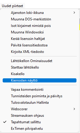 ExTimen perusasetuksissa ( valikko, ja välilehti ) täpätään näytön yläosan kohta . ExTime mahdollistaa sarjakohtaisesti kolme erimittaista kierrosta, joiden on oltava tietyssä järjestyksessä.