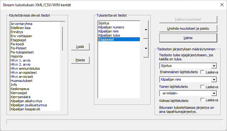 ExTimen tietoluetteloon on lisätty Etappiajat. Tämä tarkoittaa kierroslaskennassa kierrokseen käytettyä aikaa ja väliaikakilpailuissa kahden väliaikapisteen välillä kulutettua aikaa. Streamauksessa kirjoitettaviin tiedostoihin (XML/CSV) kirjoitetaan kaikki urheilijan toteutuneiden kierrosten ajat ja ikkunaan (WIN) tulostettaessa tulostetaan vain viimeiseen kierrokseen käytetty aika. Vastaavasti määrittelyllä Kierrosajat tulostuvat kumulatiiviset ajat jokaisen kierroksen lopussa. Oikean puolen esimerkin määrittelyillä urheilijasta, jonka suoritus on siis vielä kesken, tulostuu Kilpailijan tulos-kenttään kierroksen lopussa urrheilijan kokonaisaika tämän kierroksen lopussa ja Etappiajat-kenttään tähän viimeiseen kierrokseen käytetty aika. Jos Sijoitus-kenttä olisi mukana, niin kentässä näkyvä sijaluku olisi urheilijan kokonaissijoitus sarjassaan, ei tämän yhden kierroksen sija. Tässä Lapuan 2020-SM-kävelyistä Tiian Kuikan kolme viimeistä kierrosta kuvan määrityksillä: