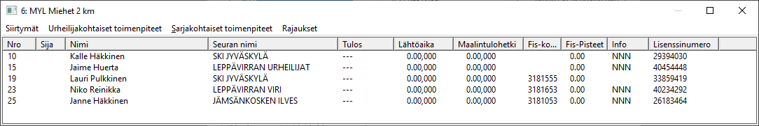 vaihtoehtoa näpäyttämällä selain joko kysyy tai ei kysy, minne siirtotiedosto halutaan laittaa. Jokaisella ajanottajalla on varmaan oma käytäntönsä, itse avaan uuden kilpailukauden alkaessa kaudelle oman kansionsa ja teen sinne alihakemiston KILMO. (Ja live-, tulosarkisto-, FIS-, lisenssit- ja muita kansioita) ExTime-ohjelman käyttäjien ei tarvitse tehdä excelillä mitään tiedoston muokkausta, vaan ExTime lukee tiedoston sellaisenaan. Toki excel-siirron parametrien on oltava kunnossa, siitä seuraavassa. Esimerkin siirtotiedosto näyttää teksturissa seuraavalta: "40392178";"A";"Kerttu Niskanen";"NYL";"1988";"Vieremän Koitto";"3185168" "21443439";"Try Out";"Arto Frosti";"MYL";"1991";"Lappeen Riento";"3180956" "32169388";"A";"Eveliina Toivanen";"NYL";"2000";"AT Ski Team";"3185829" "32159592";"A";"Emmi Lämsä";"NYL";"1998";"AT Ski Team";"3185688" "27454516";"A";"Vilma Jylhä";"NYL";"1996";"AT Ski Team";"3185615" "29071120";"A";"Miro Karppanen";"MYL";"1998";"Imatran Urheilijat";"3181163" "33257752";"A";"Hanna Toivonen";"NYL";"2000";"Kangasalan Kisa";"3186182" "25666254";"A";"Joonas Sarkkinen";"MYL";"1994";"Proski Oulu";"3180860" "24192965";"A";"Miika Heikkilä";"MYL";"1996";"Espoon Hiihtoseura";"3181162" "25038002";"A";"Jukka Palo";"MYL";"1988";"Vihdin Viesti";"3180629" "40355563";"B1";"Kevin Hildén";"MYL";"2009";"IF Sibbo-Vargarna";"3182028" "40279365";"A";"Akseli Pitkänen";"MYL";"2005";"Teiskon Urheilijat";"3181708" |