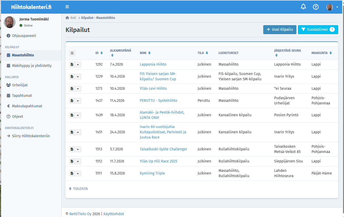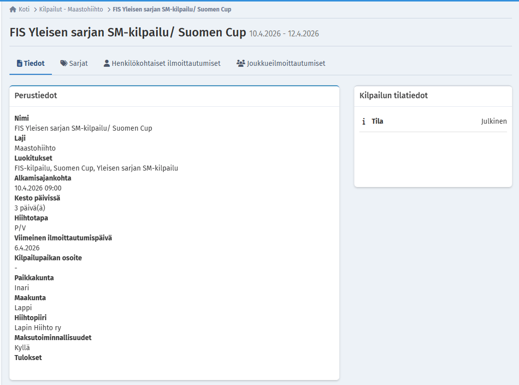 Sisäänkirjautumisen jälkeen saadaan seuraavan kaltainen näkymä, kun valittuna lajina on Maastohiihto: