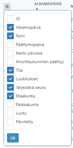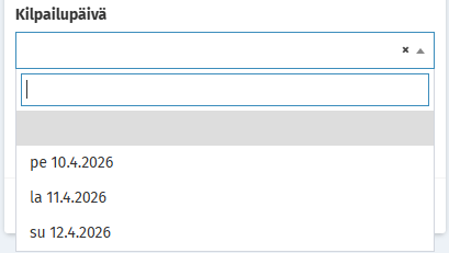 Perusnäkymän kisajärjestystä voi vaihtaa klikkaamalla otsikossa ko. sarakkeen kohdalla olevaa salmiakkia. Silloin salmiakki vaihtaa muotoaan ilmoittamaan, että järjestys on tämän tiedon mukainen. Näkyvien kisojen määrää voi rajata suodattimilla, oheisessa esimerkissä on otettu mukaan kalenterista löytyvät kisat 7.4.2026 alkaen. |