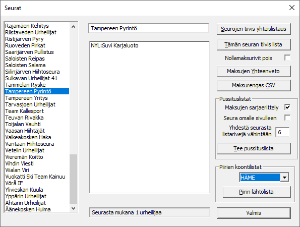 Riippuen siitä halutaanko ladata henkilökohtaiset listat vai viestin listat valitaan joko tai . Sitä klikkaamalla saadaan näkyviin kisaan ilmoitetut urheilijat tai viestijoukkueet.