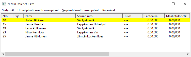 Yläpuolen kuvassa näkyy usea urheilija kahteen kertaan, ero on heidän sarja-sarakkeessaan. Ylllä on siis kaikki yksilöilmoittautuneet, joten tarvitaan suodatusta urheilijoiden jakamiseksi kisapäiväkohtaisiin tiedostoihin. Toki tämä jako voidaan tehdä myös Excelissä tai tulospalveuohjelmassa. Itse pidän parhaana ladata osanottajat KILMOsta jo suoraan päiväkohtaisiin tiedostoihin.