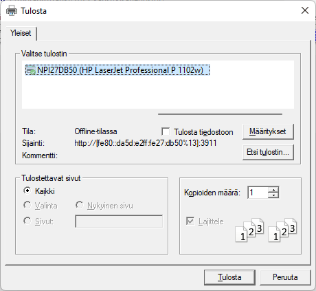 Kopiot-määre taas kertoo paperikopioiden lukumäärän. Parhaiten se itselläni toimi XP-ympäristössä siten, että kirjoitimen valinnassa asetan kopio-määrän windowsin omaan kirjoittimen valintaikkunaan. Jotain outoa tuossa vielä on, oletusmäärä ei aina näy Kopioiden määrän alkuarvona, tutkiminen jatkuu..... |