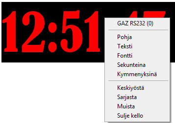 Laitteen kytkemisen jälkeen kopiointi aloitetaan viemällä hiiri kisakellonäytön päälle ja painamalla hiiren oikeaa näppäintä, jotta saadaan kisakellon ohjausvalikko näkyviin. Menuun on ilmestynyt näyttölaitteen nimi (GAZ), liitäntätapa (RS232) ja suluissa sille varattu liityntänumero (0). Jos laitenimen edessä on pallukka (kuva eniten oikealla), kopiointi laitteelle on käytössä, ilman pallukkaa kopiointia ei tehdä. Valitsemalla laitteen rivi, laite joko valitaan kopiointilaitteeksi tai vapautetaan. Jos jokin toinen laite oli varattuna kopioinnille, se vapautuu automaattisesti uuden laitteen tultua valituksi. Pientä säätöä tein kopiointiin. Jos kisakellon tarkkuus on kymmenysosia, niin kun kopiointi alkaa, tarkkuus muuttuu sekunnin tarkkuudelle. Jos taulu sitten käytännössä kestääkin tuon kymmenyksillä pelaamisen, niin sitten se sallitaan. Testit näyttää.. Urheilijan ajan ollessa kisakellossa, niin hänen saamaansa maaliaikaa näytetään XX sekuntia maaliin tulon jälkeen. Ja tuo XX laitetaan asetuksissa / / Välilehti XX on alueen ruudussa . Sen oletusarvo on 4 sekuntia. |