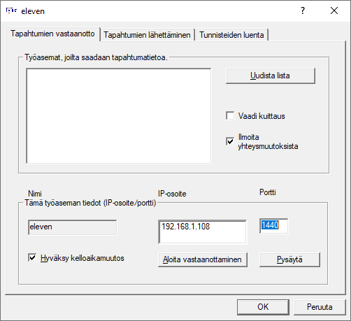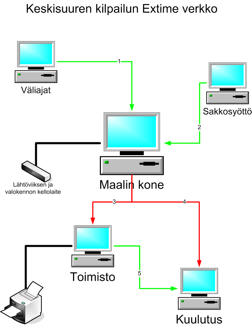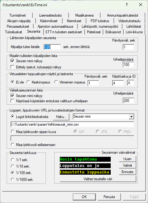 Verkon käytön tarkemmat ohjeet löytyvät tiedostosta verkko.htm. Nyt vain muistutan, että koneiden kelloajat pitää muistaa täsmäyttää (/). Tämä siksi, että seurantanäytöissä tarvitaan todellista kilpailuaikaa. -valikon on kuuluttajan seurantaa varten oma ajan tarkkuutensa, jonka käypänen arvo on yksi sekunti, sitä käytetään, kun kilpailijoille lasketaan seurantaikkunassa virtuaalista loppuaikaa. Kuuluttajan työasema on verkossa ExTimen kannalta jonon loppupäässä, joten kelloaika tulee automaattisesti maalin koneelta kun siellä ajat täsmäytetään.