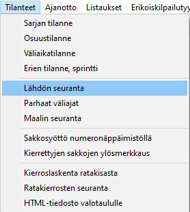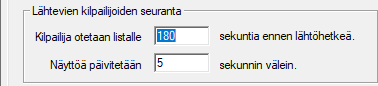 Näytössä on ylimpänä alueella Lähtevien kilpailijoiden seuranta kaksi lukuarvoa. Ylempi ilmoittaa sekuntimäärän siitä, kuinka paljon ennen lähtöä kilpailijan nimi ilmestyy seurantalistalle. 3 minuuttia (180 sekuntia) on ihan käypänen arvo, kun on menossa normaali väliaikakisa. Yhteislähdön seurantaa on parempi seurata suoraan ikkunasta, siitä selostamon hardware-ikkunasta. Tiedon Näyttöä päivitetään arvona on sekuntiluku, kuinka usein ExTimen halutaan tutkivan lähdön tilannetta. 5 sekuntia on ihan hyvä arvo, sillä vaikka normaalisti lähdössä tapahtuu muutoksia 30 sekunnin välein, saadaan matkaan lähtenyt näytöstä pois kohtuu pian lähdön jälkeen ja uusi tilalle. Lähdön seuranta lähtee liikkelle valikon toiminnosta . |