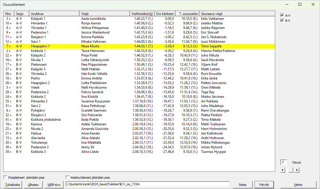 Kuuluttajalle tein viestin seurantaa varten oman -näytön, joka löytyy -valikon kohdasta . Oikeasta reunasta seurattavat viestisarjat, malli oikealla on vuoden 2024 Keski-Pohjanmaan maakuntaviestistä. Näytön neljä ensimmäistä saraketta ovat vakiot, joukkueen numero, joukkueen sarja, joukkueen seura ja viestinviejän nimi. Seuraavilla kolmella sarakkeella ovat sitten joukkueen aika vaihdossa, ero johtavaan joukkueeseen ja viestinviejän oma osuusaika ja suluissa sijoitus osuudellaan. Viimeisenä sarakkeena on kuuluttajien pyynnöstä seuraavaksi lähtevän viestinviejän nimi. Ja jälleen sarakeotsikkoa klikkaamalla saadaan näyttö klikatun sarakkeen mukaan järjestykseen, toistamalla sama sarake päinvastaiseenkin. Näyttö toimii myös, vaikka kerralla valitaan monta sarjaa seurattavaksi, tällä on tosin merkitystä vain, jos sarjat lähtivät samaan aikaan ja osuudet ovat yhtä pitkät. Tuplaklikkaamalla näytössä näkyvää joukkuetta saadaan näkyviin sen kaikki tiedot, vaikkapa korjailua varten. Kuuluttajan ei ole tosin syytä korjailla mitään. |