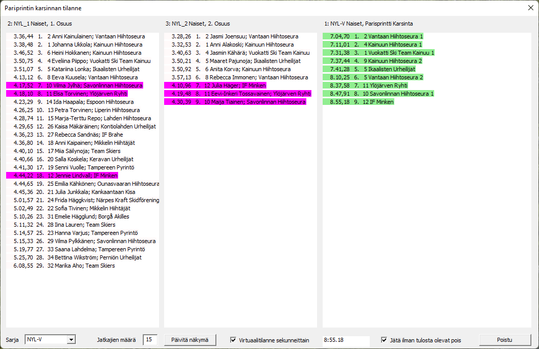 Jälkimmäisen sarjan aikana voidaan jo seurata joukkueiden keskinäistä paremmusjärjestystä, jossa siis molempien urheilijoiden ajat on laskettu yhteen (linkin kuvassa vihreällä ovat kuvan hetkellä menossa jatkoon ja violetit viimeisiä tapahtumia). Kuvassa on rastittu ilman tulosta olevat pois näykyvistä.